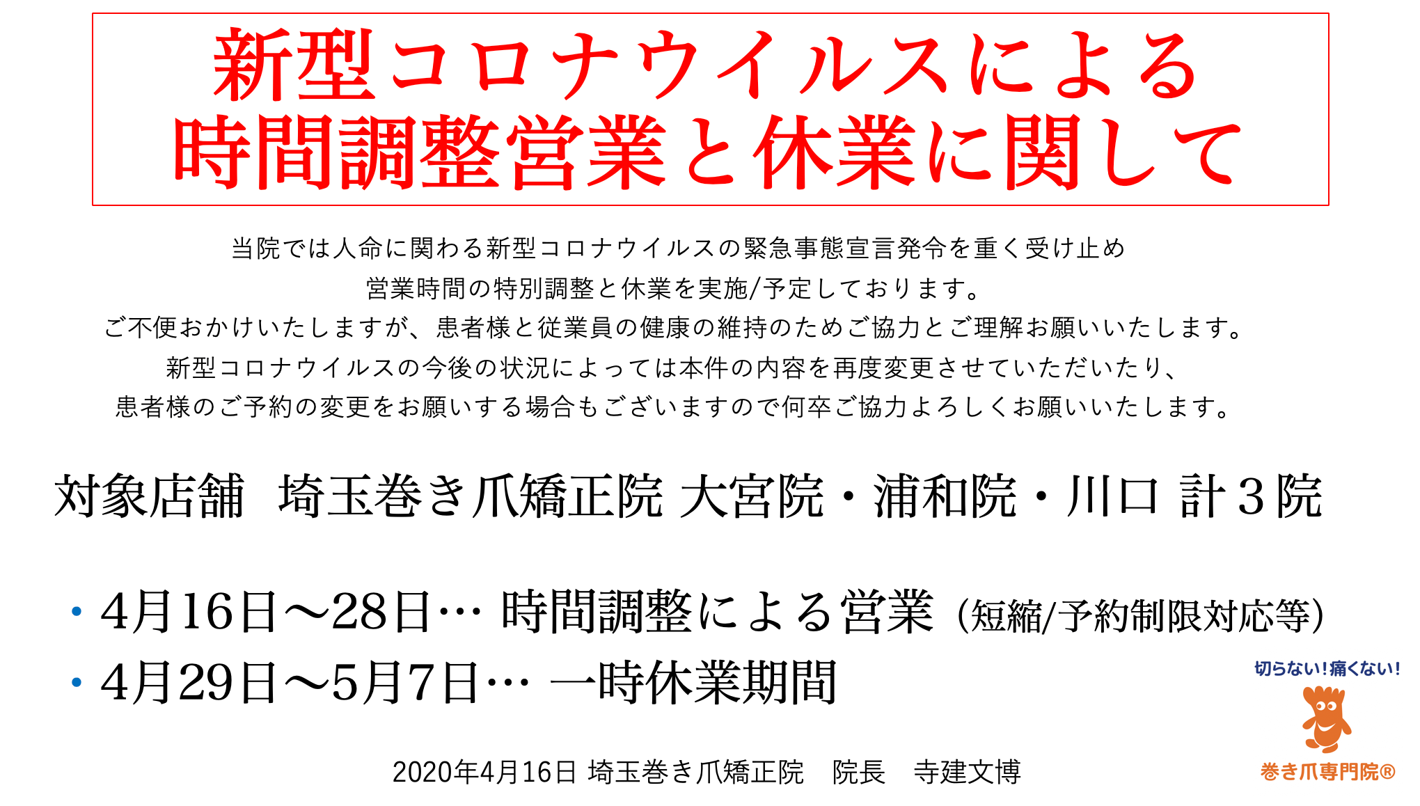 埼玉巻き爪矯正院 川口院 コロナウイルスによる営業時間変更と休業の案内